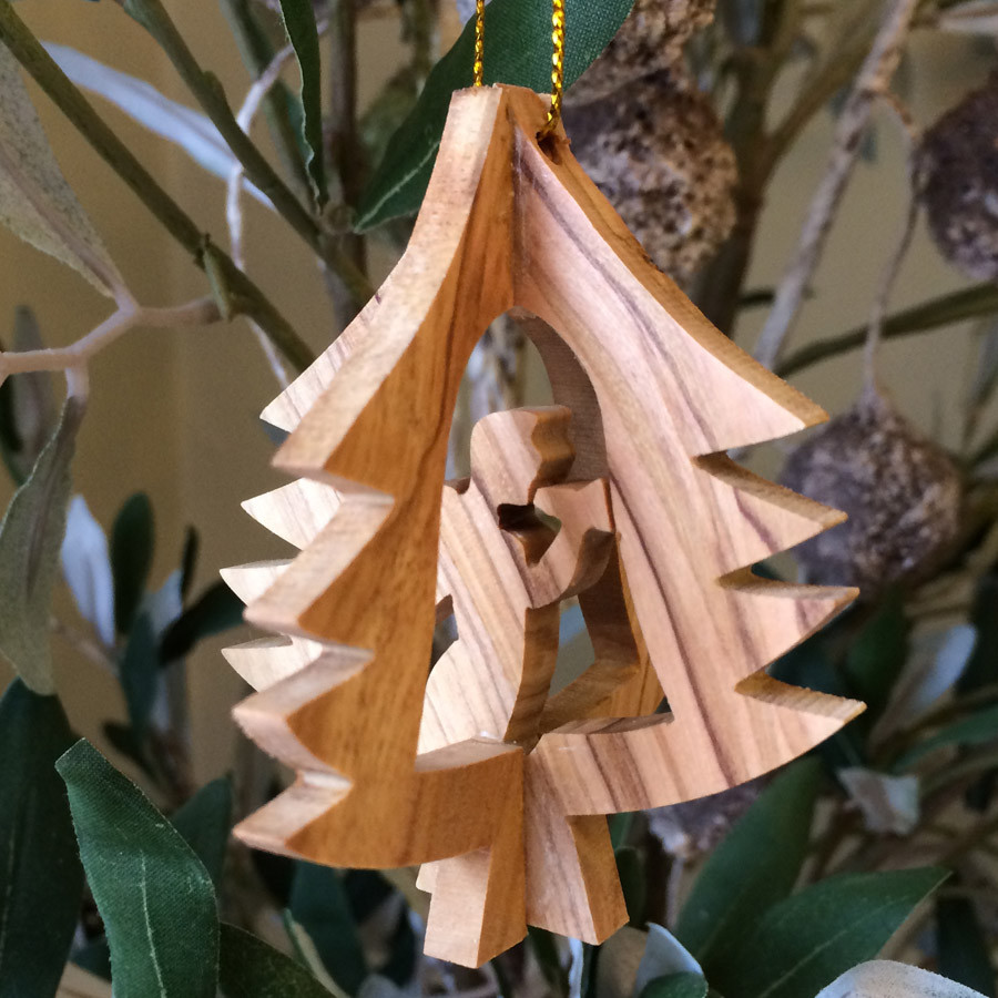 This exclusive 3-D ornament is hand carved in Bethlehem, the Holy Land. A scroll saw is used to carve this intricate design. The rich color and interesting veins are characteristic of the beautiful Bethlehem Olive Wood. This ornament comes ready to hang complete with a golden string and an explanation card (describing the workmanship).