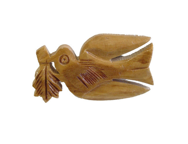 Olive Wood Brooch Dove Of Peace. This unique design was exclusively hand carved in Bethlehem, the Holy Land using a scroll saw. It comes on a pin ready to wear. An explanation card is included. About 1" in height.