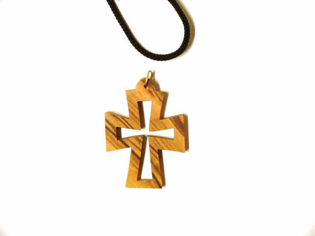 Olive Wood Cross pendant. This unique design was exclusively hand carved in Bethlehem, the Holy Land using a scroll saw. It comes on a black adjustable cord ready to wear. An explanation card is included. About 2" in height.