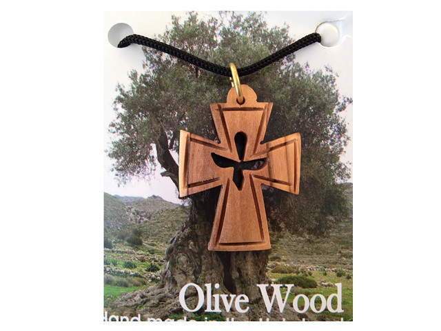 Olive Wood Cross With Dove pendant. This unique design was exclusively hand carved in Bethlehem, the Holy Land using a scroll saw. It comes on a black adjustable cord ready to wear. An explanation card is included. About 1.3" in height.