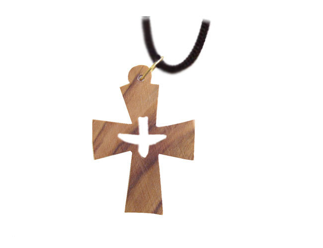 Olive Wood Cross With Dove pendant. This unique design was exclusively hand carved in Bethlehem, the Holy Land using a scroll saw. It comes on a black adjustable cord ready to wear. An explanation card is included. About 1.4" in height.