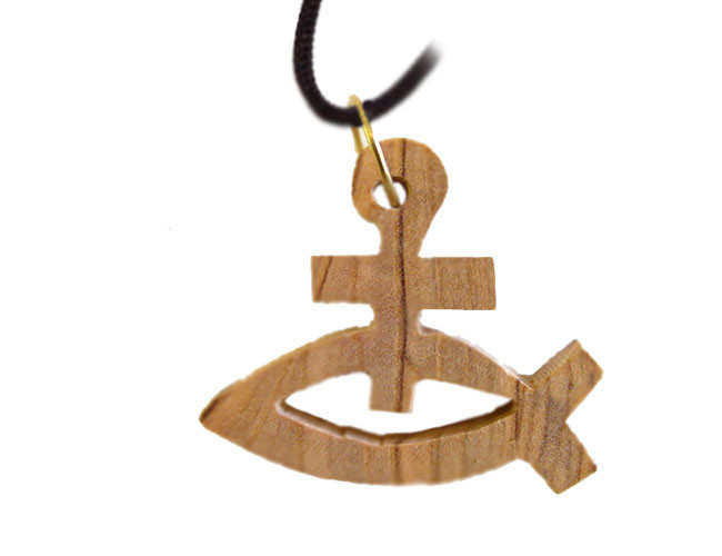 Olive Wood Christian Fish and Cross pendant. This unique design was exclusively hand carved in Bethlehem, the Holy Land using a scroll saw. It comes on a black adjustable cord ready to wear. An explanation card is included. About 1.2" in height.