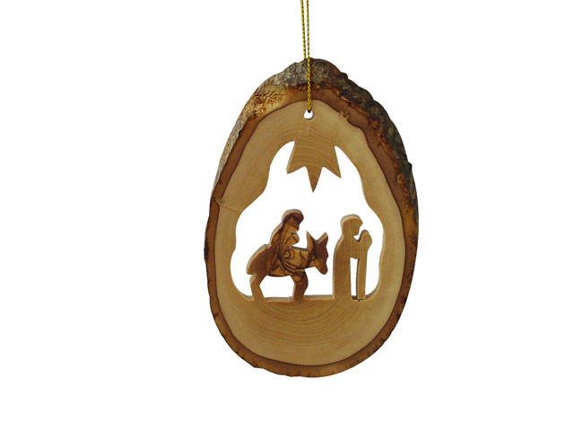 Flight Into Egypt Christmas Tree Ornament. Add a special touch to your Holiday Season this year with Olive Wood Ornaments. This unique design was exclusively hand carved in Bethlehem, the Holy Land using a scroll saw. This ornament comes with the natural bark of the Olive Tree. Ready to hang. Comes with a golden string and an explanation card.