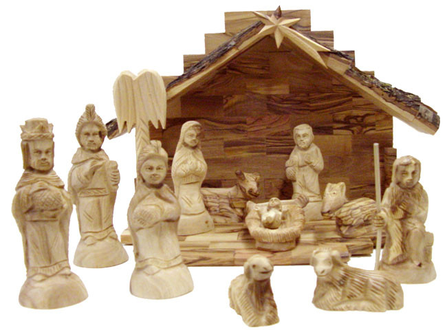 Loading... Please wait...Exquisite Hand Carved Nativity Set From Bethlehem. This Bethlehem Olive Wood Nativity Set makes a very meaningful and special gift that will be cherished for a lifetime. Set includes: Joseph, Mary, Baby Jesus (in his crib), Three Kings, a Shepherd (with staff), a Cow, a Donkey and Two Sheep. The height of the figures is about 4.5 inches.