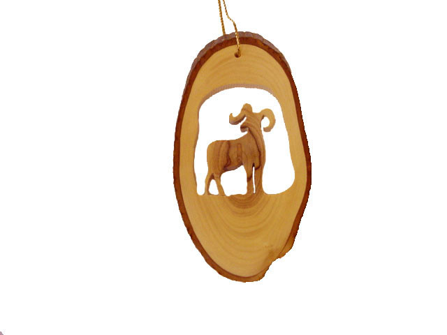 Big Horn Sheep. Add a special touch to your Holiday Season this year with Olive Wood Wild Life Ornaments. This unique design was exclusively hand carved in Bethlehem, the Holy Land using a scroll saw. This ornament comes with the natural bark of the Olive Tree. Ready to hang. Comes with a golden string and an explanation card.