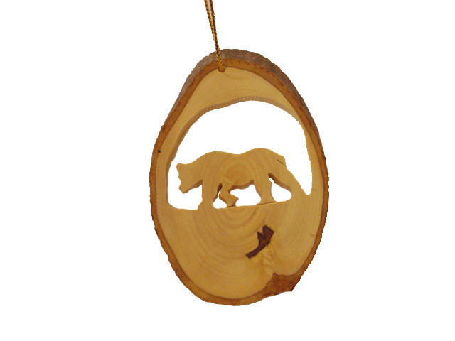 Grizzly Bear Ornament. Add a special touch to your Holiday Season this year with Olive Wood Wild Life Ornaments. This unique design was exclusively hand carved in Bethlehem, the Holy Land using a scroll saw. This ornament comes with the natural bark of the Olive Tree. Ready to hang. Comes with a golden string and an explanation card.